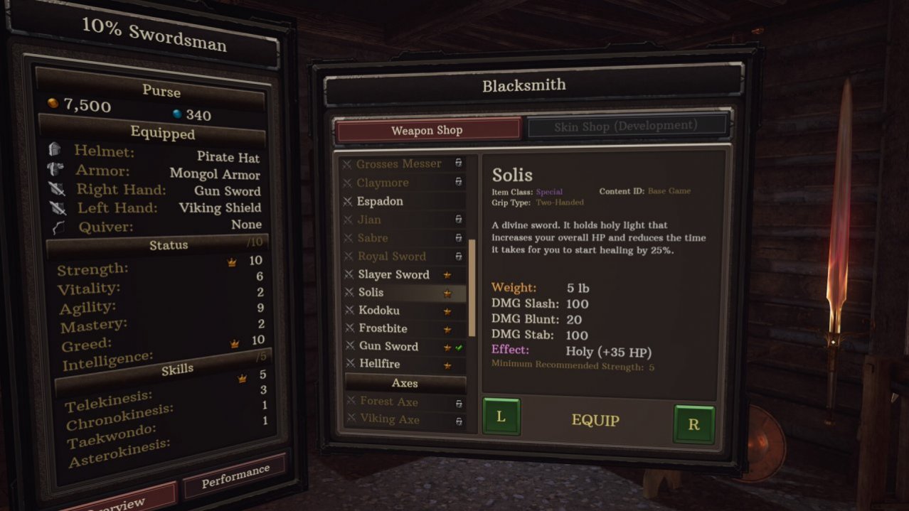 Сражайтесь в семи различных тематических окружениях против четырёх различных культур, зомби и пяти различных боссов, используя десятки видов оружия, щитов и брони, а также девять статов и навыков. Используйте телекинез для захвата оружия, хронокинез для манипуляции временем, а также различные статы для повышения силы, скорости, жизненной энергии и многого другого. Предметы, которые вы выбираете, носите или модернизируете, влияют на ощущения от игры, позволяя вам создать интересного персонажа с различными сильными и слабыми сторонами. Улучшите свой показатель силы, чтобы с лёгкостью носить оружие. Улучшите показатель ловкости, чтобы повысить скорость передвижения в тяжелой броне. Не нравится тяжелая броня? Тогда надевайте самурайские доспехи и прокладывайте себе путь сквозь врагов на полной скорости.